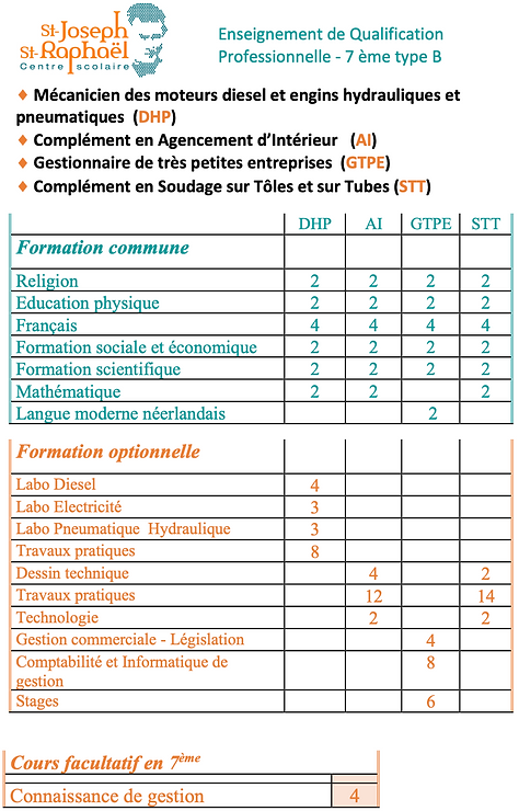 Après la réussite des 5ème et 6ème années, certificat de mécanicien(ne) d'entretien automobile et possibilité d’entrer sur le marché du travail, ou de continuer une 7ème année Diesel-hydraulique- pneumatique donnant accès aux études supérieures et/ou ouvrant la porte à un vaste choix de professions.